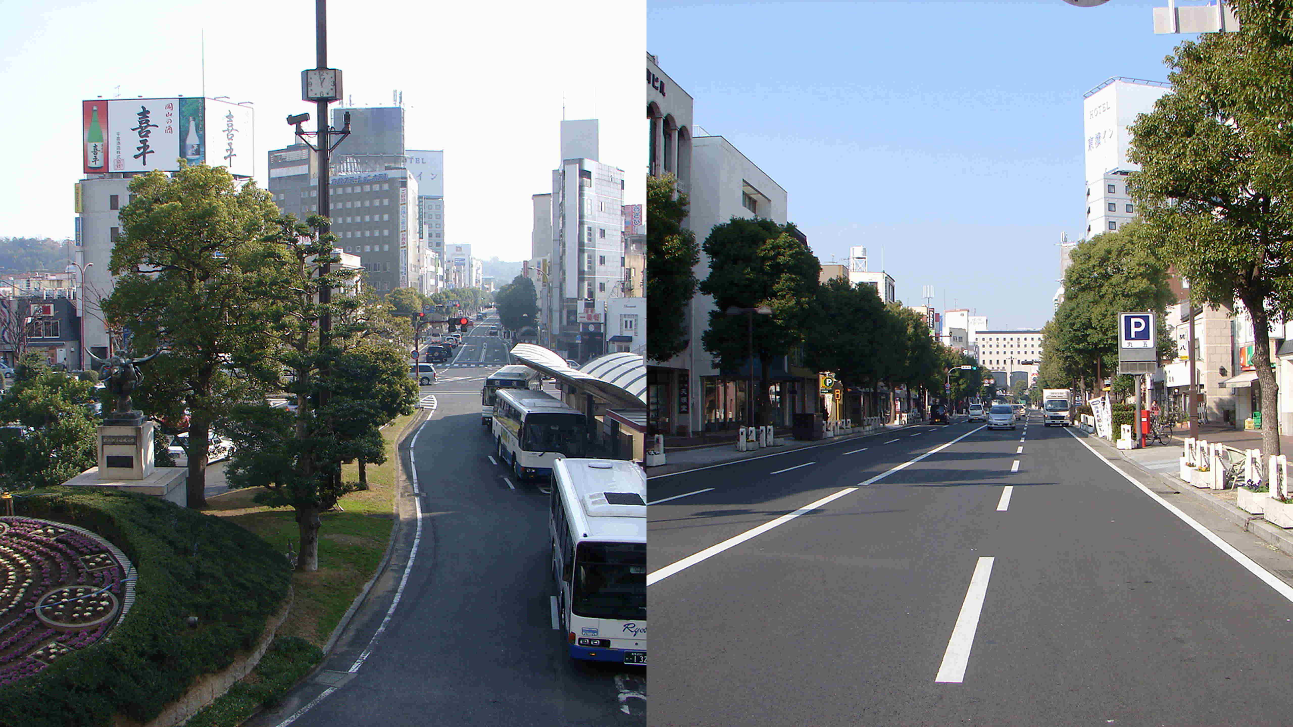 (左)JR倉敷駅から美観地区に至る倉敷中央通り (右)倉敷中央通り〜美観地区側からJR倉敷駅方向を望む