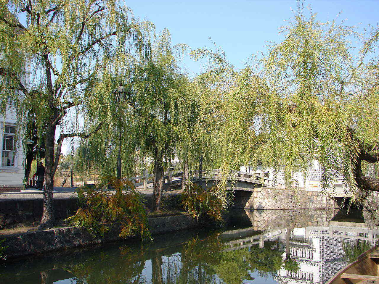 美観地区メインスポットのひとつ倉敷川と柳〜今橋から中橋を眺める