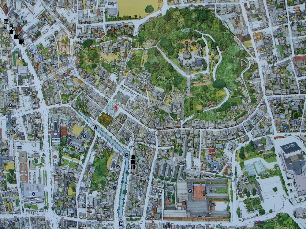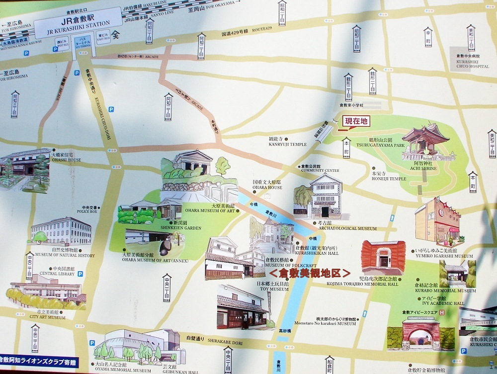 ▲倉敷川畔美観地区鳥瞰絵図(現地説明板より。黒文字は絵図に記述したもの)