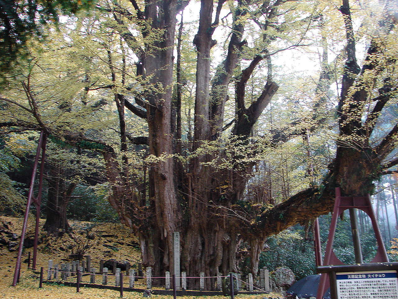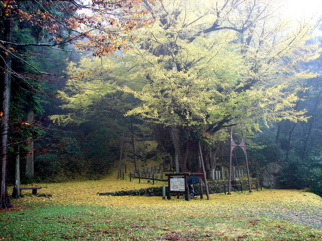 ![]() 幾本にも分かれて伸びる枝 目通り周囲約12メートル、高さ約45メートル、樹齢推定900年を超えた、国内でも屈指の巨樹である。昭和3年、国の天然記念物に指定され、また全国名木百選にも選ばれている。町では、イチョウを町木に指定し、その保護に力を注いでおり、町民一人ひとりの心の中に大銀杏が息づいている。 |
