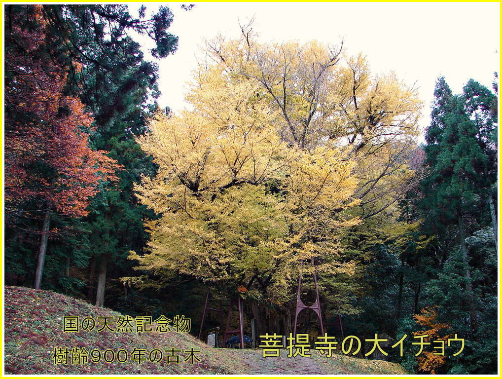 ![]() 推定樹齢900年超、県下最大の大イチョウ 浄土宗の開祖、法然上人が学問成就を祈願してさした杖が芽吹いたといわれる。この天を覆う銀杏の巨樹は、国定公園那岐山の古刹、菩提寺の境内で歴史の重みをかさねながら静かに息をひそめつつ立っている。訪問(2011年12月3日)した時には、南側の上部分が落葉していましたが、まだ黄色い葉が残っていました。 |