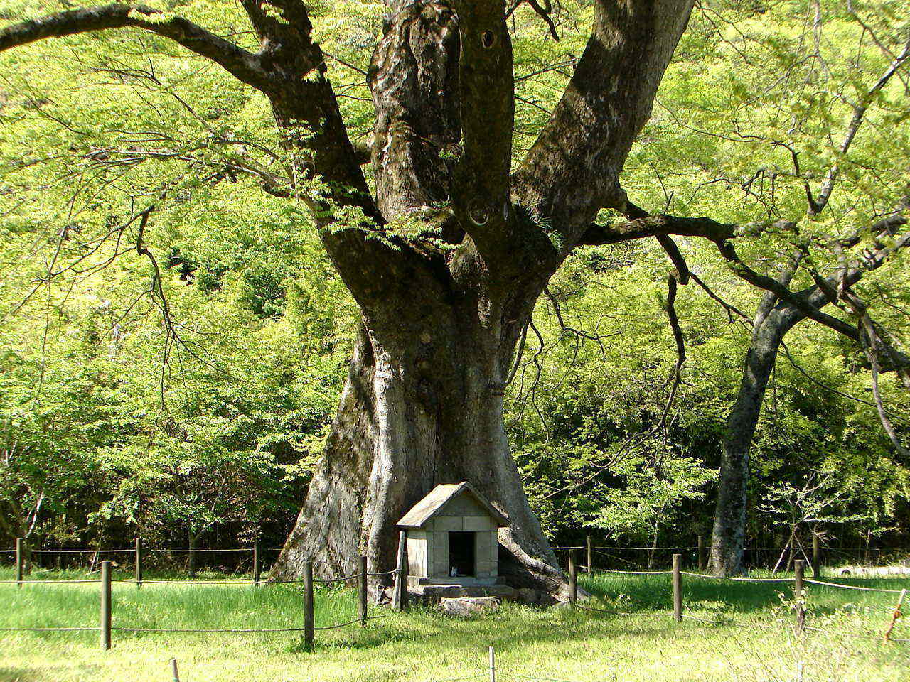 ![]() 根元には荒神社の小さな祠がまつられており、昔は祭礼が営まれ、現在に至るまで神木としてあがめられている。どっしりと根を下ろし、1000年の歴史の移り変わりと住民を見守る神木 |