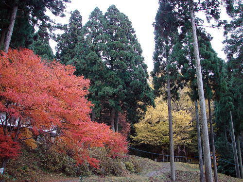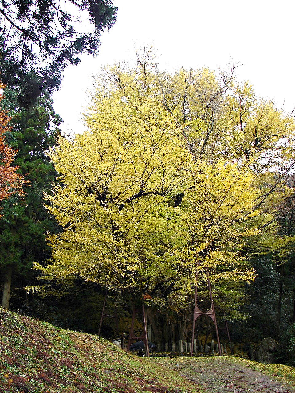 ![]() 推定樹齢900年超、県下最大の大イチョウ 浄土宗の開祖、法然上人が学問成就を祈願してさした杖が芽吹いたといわれる。この天を覆う銀杏の巨樹は、国定公園那岐山の古刹、菩提寺の境内で歴史の重みをかさねながら静かに息をひそめつつ立っている。訪問(2011年12月3日)した時には、南側の上部分が落葉していましたが、まだ黄色い葉が残っていました。 |