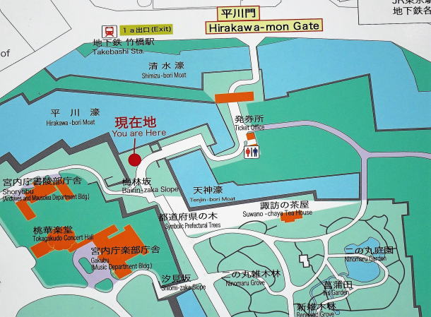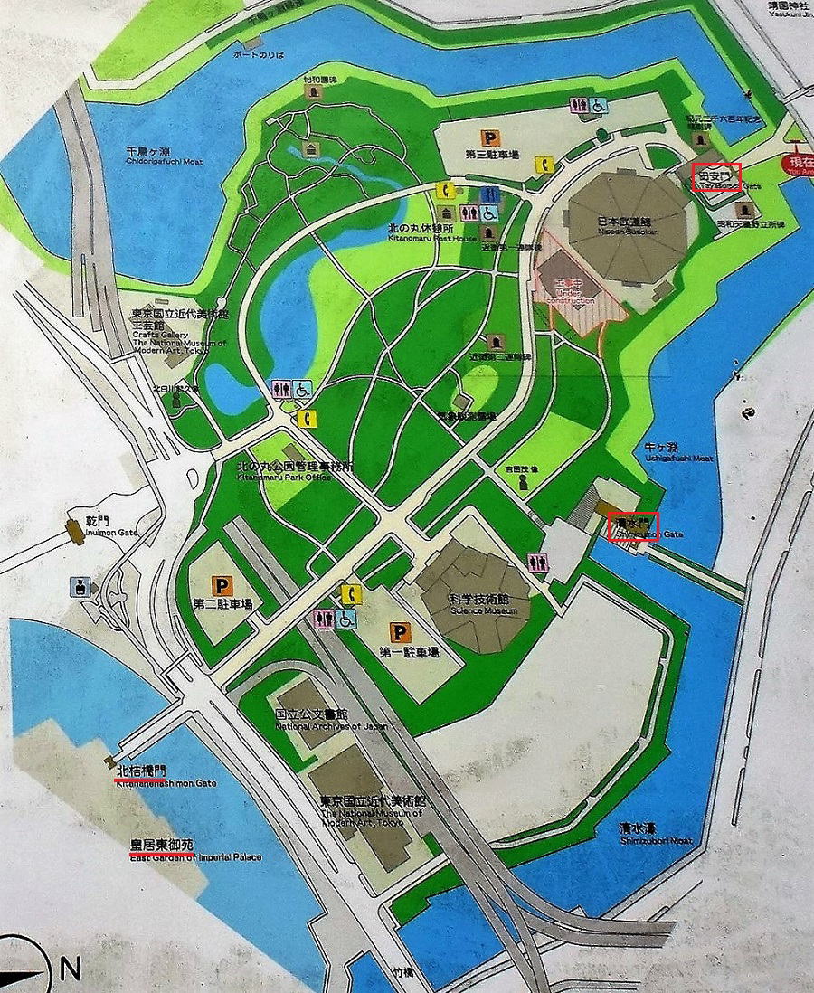 | 北の丸公園の清水門、田安門を巡ります 北の丸公園案内図 ![]() (現地説明板より。画像は一部加工) |