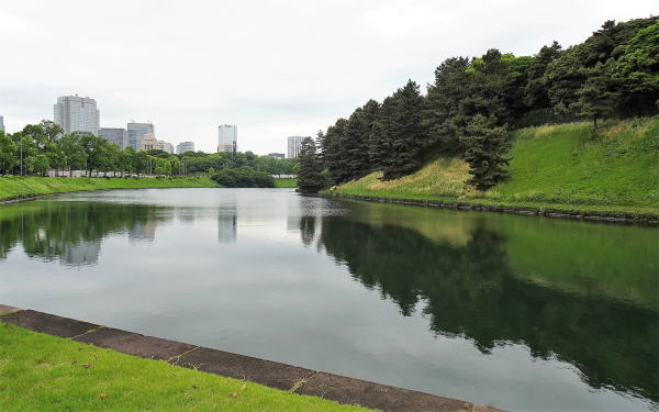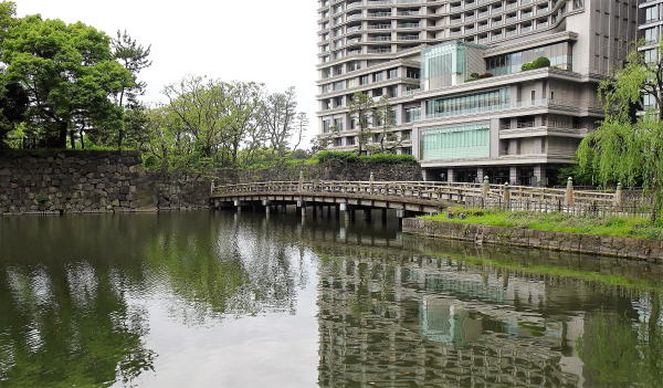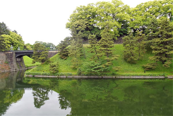 ![]() 桜田濠 外桜田門にむかって左側の濠。江戸城の重要な土塁は、土塁の上に低い石垣を築いた「鉢巻土塁(土居)」となっている。左奥に国会議事堂が見えます。 |