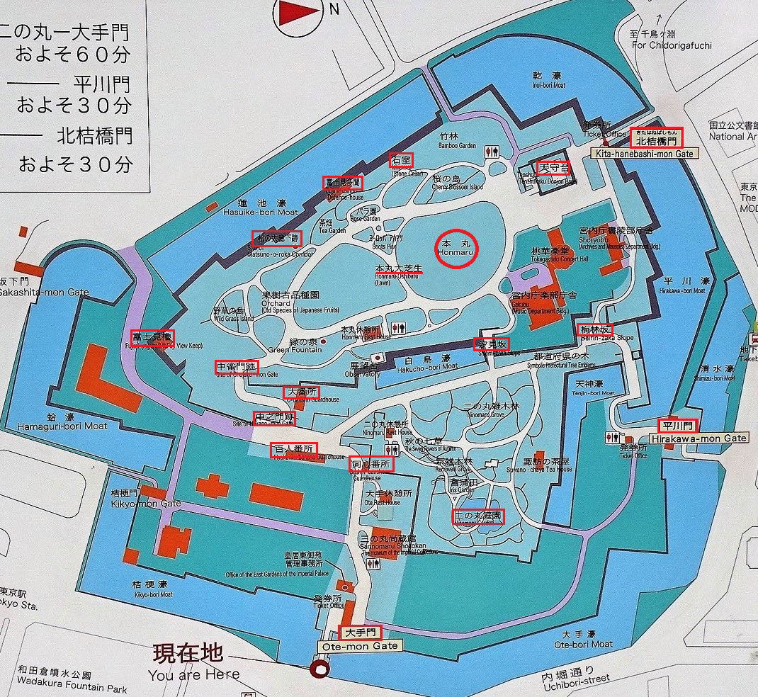 江戸城地図(説明板より。画像に一部追記) 大手門から同心番所、百人番所、中之門跡、大番所、中雀門跡を巡ります |