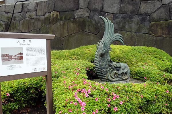 ![]() 大手門の渡櫓門 渡櫓門は、昭和20年(1945年)4月の空襲で焼失し、昭和42年(1967年)に復元されました。大小2つの門に囲まれた枡形は、侵入する敵を阻止・攻撃し易い構造になっています。渡櫓門の内側には鯱(右写真)が展示されています。 |