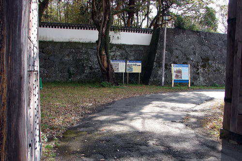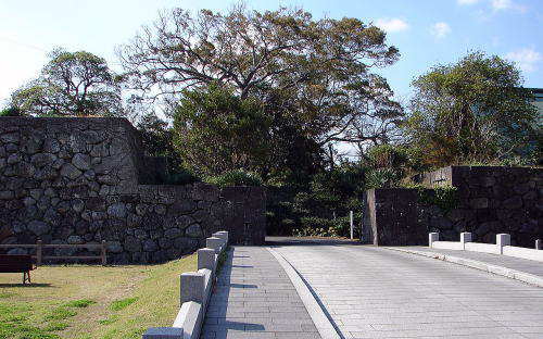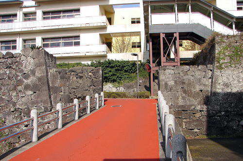 ![]() ⑤表蹴出門⑥表門(大手門) 表門を入ると本丸跡で、今は五島高校が建つ。表門も入って左折れの内枡形となる。この場所は五島高校の敷地内です。ここから先は入城しませんでした。 |