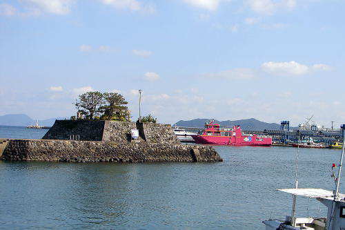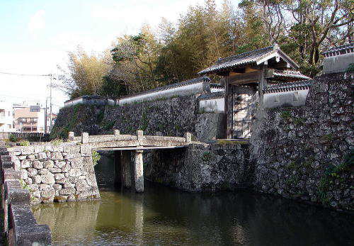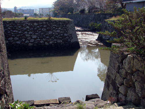 ![]() ②水門 海に面した東側に築かれた舟入跡。手前の外堀は、当時海で水門は城内から直接海に出られる構造。後ろの城郭風の建物は、五島観光歴史資料館(左)と市立図書館(右)。 |