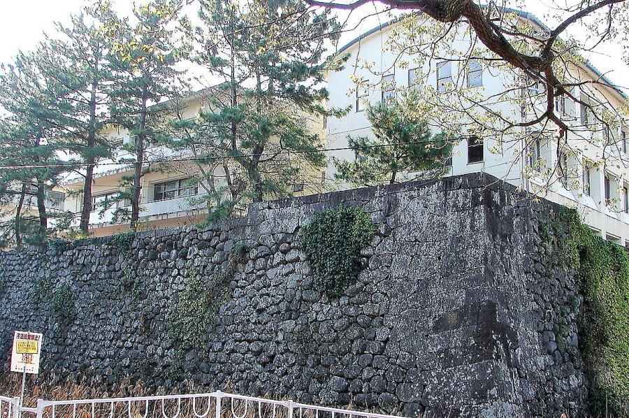 ![]() ⑦本丸(めがね橋門) ここからも、橋を渡って本丸に入場できる。石垣の後ろは五島高校。 |
