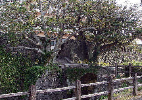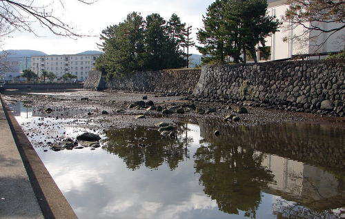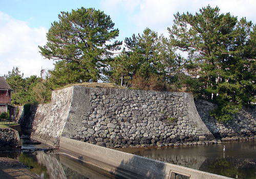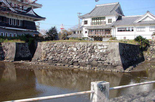 ![]() 東シナ海を外堀にした福江城 外堀公園から望む二ノ丸東面の石垣と外堀。築城当時、この外堀は海であった。現在でも海水を取り入れており、海の満ち引きの影響を受ける。 |