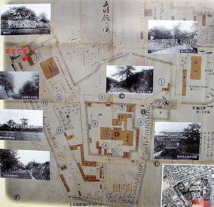 ①御番門(表門)②水門 ③御築山橋 ④二ノ丸 ⑤表蹴出門 ⑥表門(大手門) ⑦本丸 ⑧中奥角櫓 ⑨埋門 ⑩裏蹴出門(現在) ⑪馬場 ⑫御隠殿(現在) ⑬心字が池(現在) ⑭横町口蹴出門(現在) ⑮横町橋(現在) ⑯台場 天守は築かれなかった ※Ⓐ~Ⓕは追記 Ⓐ五島市立図書館 Ⓑ五島観光歴史資料館 Ⓒ福江文化会館 Ⓓ五島高校 Ⓔ外濠公園 Ⓕ武家屋敷通り |