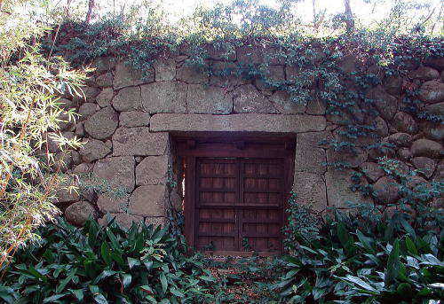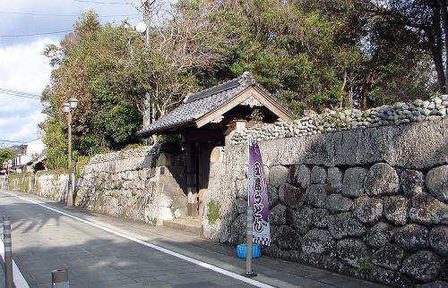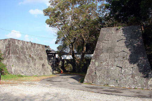 ![]() 福江武家屋敷大道 五島市の福江地区は、五島藩の城下町として発展してきた。約400m続く石垣は、溶岩塊の石垣を積み上げ、その上にこぼれ石といわれる丸石を積み重ね、両端は蒲鉾形の石で止められ、全国的に見ても類例をみない造りとなっている。 門は、ほとんどが薬医門とよばれる門構えになっている。 |
