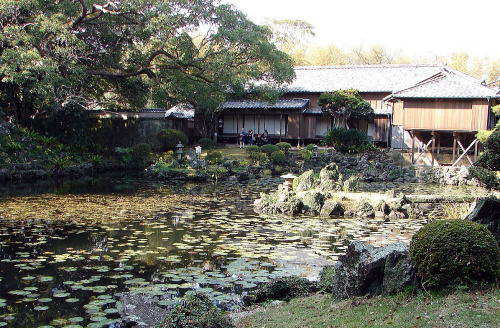 ![]() ⑫御隠殿と⑬心字が池(国指定名勝) 五島氏庭園内部。建物は藩主の隠居屋敷、庭園は林泉回遊式の日本庭園。 |