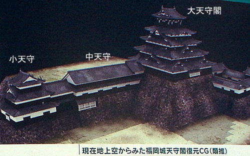 ![]() ▲福岡城天守閣復元CG(現地説明板より)〜天守閣の有無については議論されていますが、仮に存在したとすると、天守台の礎石や石垣の規模から5層の大天守閣が建っていたと推定され、東側に中天守、小天守が立ち並ぶ52万石の大藩にふさわしい偉容を誇ったに違いありません。 |