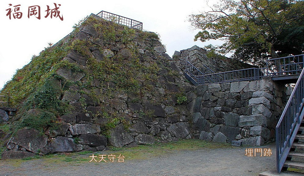 | 天守の現況 | 天守台のみ残る。福岡城には天守閣が存在しなかったというのが定説でしたが、近年では天守閣の存在をうかがわせる文書の発見などもあり、多くの人の関心をひいています。 |