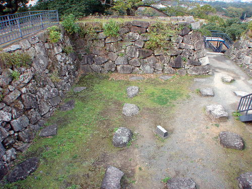 ![]() ▲大天守台跡(穴蔵)〜大天守台には東西6列、南北9列の礎石列があり、42個の礎石が残っている。 |