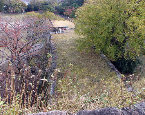 ![]() ▲鉄御門跡(くろがねごもんあと)〜要衝の門にふさわしく、敵の侵入を防ぐため幅が狭くなっています。高く積まれた石垣の上に櫓や塀が張り巡らされ、上から攻撃できるようになっていました。この鉄御門跡の先には埋門跡があり、やはり狭い門となっています。 |