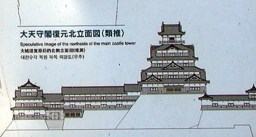 ![]() ▲大天守閣復元北立面図(現地説明板より)〜定説では福岡城には天守閣がもともと建設されなかったとされていますが、近年では天守閣の存在をうかがわせる文章が発見され、「はじめは天守閣が建設されたが、後年取り壊されたのではないか」という説も説得力を増しており、「幻の福岡城天守閣」をめぐる議論が続けられています。 |