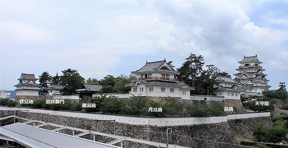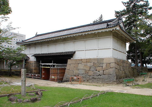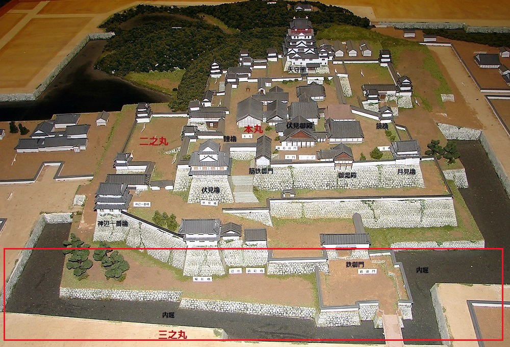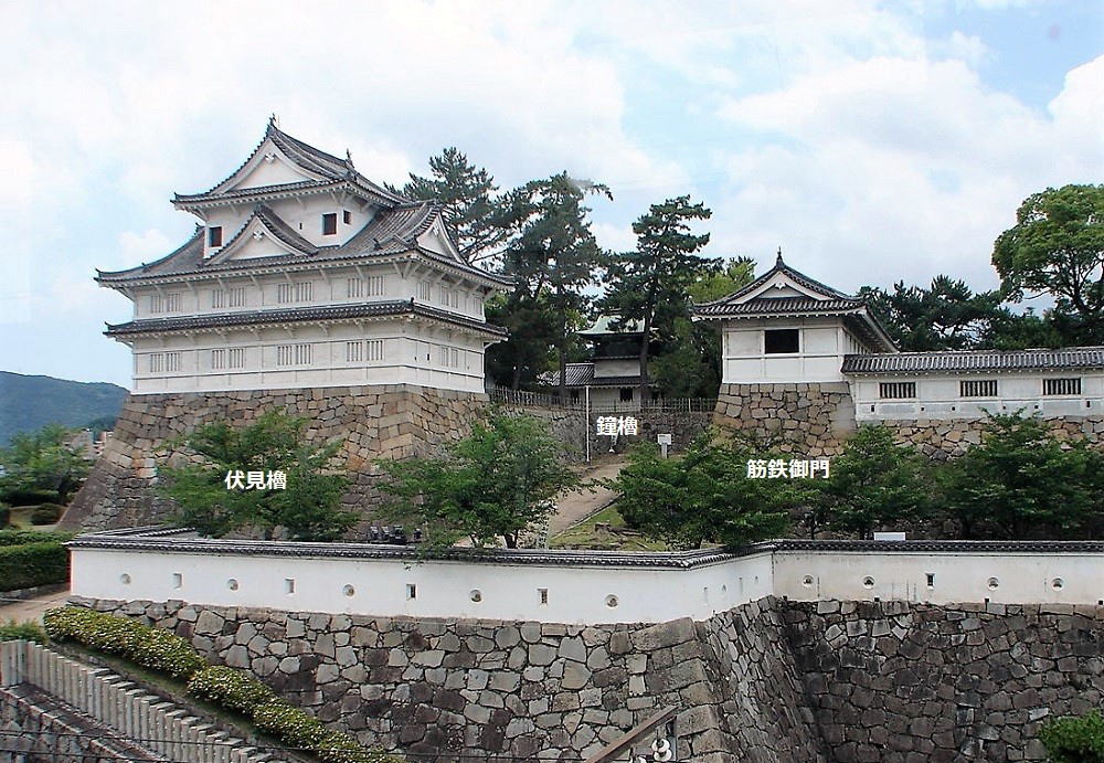 ![]() 左より、伏見櫓(国重要文化財)・鐘櫓(市重要文化財)・筋鉄御門(国重要文化財) |