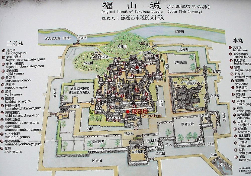 | ■現況(訪問日:2020年6月再訪問) <天守閣(博物館)展示の福山城模型に一部追記> ![]() 現在では、本丸と二之丸(一部)が残り、堀は埋められ三之丸と共に市街化されている。赤枠部分にはJR福山駅が建つ。 |