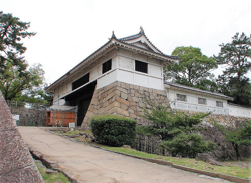 【![]() 筋鉄御門は、桁行10間、梁間3間、入母屋造、本瓦葺の脇戸付櫓門で、伏見櫓と同じく伏見城から移築された。 |