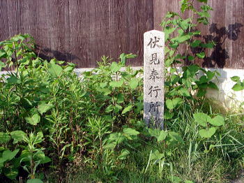 伏見奉行所跡の碑近鉄京都線「桃山御陵前」駅の南、西奉行町の桃陵(とうりょう)団地の一角にある。伏見は平安時代には鳥羽と並ぶ貴族の別荘地帯であったが、都市として繁栄したのは、豊臣秀吉がこの地に伏見城を築き、城下町と伏見港を整備してからである。 江戸時代には三代将軍徳川家光の時に豊臣ゆかりの伏見城を完全に壊し、寛永元年(1624)に富田信濃守の屋敷のあった場所に伏見奉行所を建設した。その場所は現在の桃陵団地の敷地で伏見城の跡地への入口と港を監視する位置にある(現地説明板より一部抜粋) |