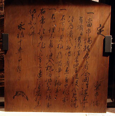 ![]() (上)天下布武の印(複製) (右)楽市場の掟を定めた「楽市楽座制札」 新興商工業者の自由な商業活動を保証する楽市楽座の政策は、戦国時代にはじまった。岐阜城に入った信長は、その直後に制札をかかげて、当国はむろん他国の者にも商業の自由を認めた。(小学館「名城をゆく」より) |