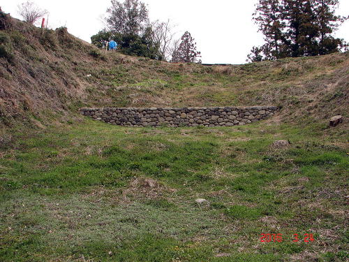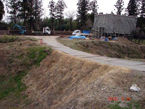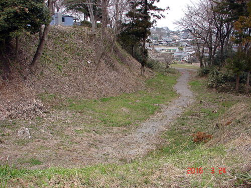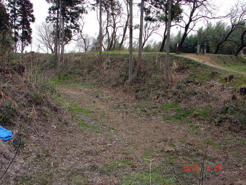 ▼ここからは、2016年3月に訪問した時の写真です![]() 城を南北二つに区切る土橋東側の大堀切 上記掲載周辺図@の場所。左の崖上は二の丸となり、建物は城門復元工事関係の事務所。 |