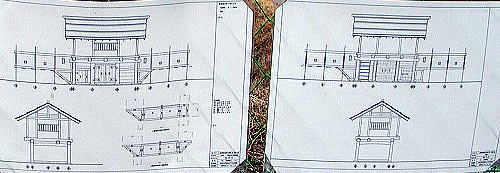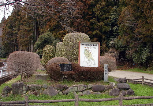 ![]() 史跡整備事業の案内板 復元する城門のイラスト ![]() (現地説明板より) |