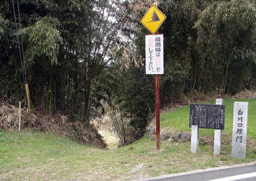 ![]() 白川口埋門 虎韜門から白川河原に出る秘密の通路で、西部城外への道はここ唯一つである。虎口(出入口)の両側に石垣を積み、上に木や石を渡して土手をその上に盛り、トンネル式に作った門を埋門(うずみもん)という。埋門跡の残っているのは県下にこれ一ヵ所である。 |