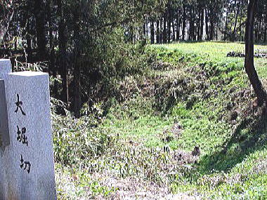 ![]() 土橋西側の大堀切 上記掲載周辺図Aの場所。この大堀切は東西に走り城を北と南の二つに分けている。こういう大規模な堀を、鍬と「もっこ」で築いた人々の労苦がしのばれる。右側が二の丸・三の丸側。 |