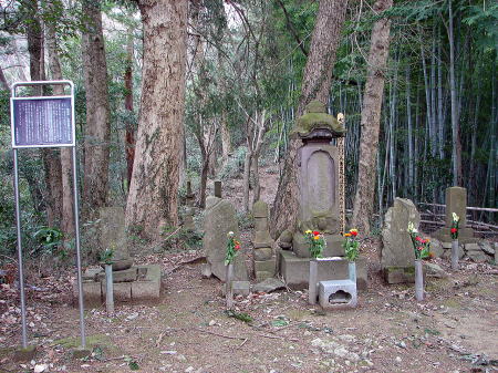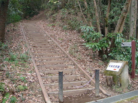 ![]() ●標識のたつ道路沿いから山へ向って歩くと、墓へ上がる階段下へとたどり着く |
