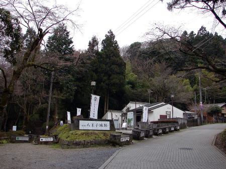 ![]() ●八王子城跡駐車場 後方の山々が八王子城跡。左側の道路奥が入口広場および管理棟。 |