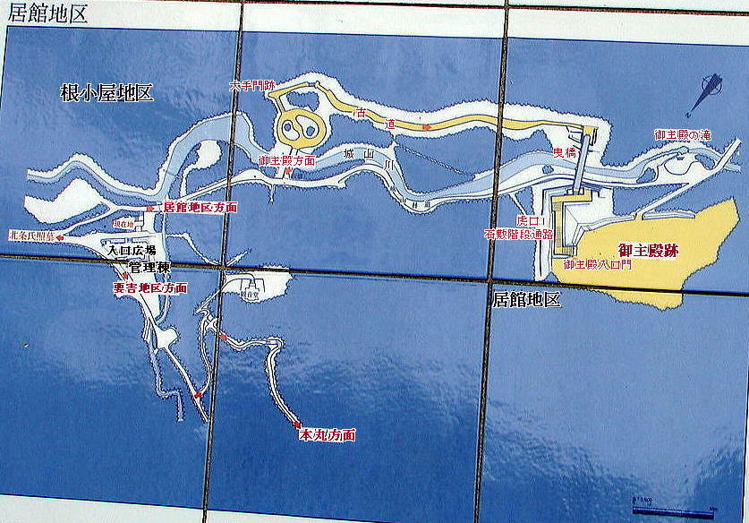 ![]() ●要害地区 要害地区は、急な斜面で守られた城山山頂から尾根の上に造られています。山頂付近には本丸・松木・小宮曲輪があり、西側には詰の城と呼ばれる曲輪が残っています。合戦の時に籠城して戦うところで、兵糧を入れる倉庫などが建てられていたと思われます。今でも2ケ所に当時の井戸が残されています。 ●居館地区 城山川沿いの山腹に御主殿と呼ばれる大きな館跡と、その東側にアシダ曲輪と呼ばれる曲輪が残っています。御主殿跡は城主・北条氏照の居館跡とされ、アシダ曲輪は有力な家臣の屋敷跡と考えられています。御主殿跡の調査では、大きな建物の跡や石を敷いた通路、溝などが発見されており、庭園もあったようです。 ●根小屋地区など 城山川に沿った、中宿付近が根小屋地区と呼ばれ、城への大手口として城下町の一部を形成していたと思われます。また、城山川の南側には細い尾根に連続して曲輪と堀切が並び、太鼓曲輪と呼ばれています。その他、小田野の曲輪群や、恩方方面の搦手口にも多くの遺構があり、城全体の守りを固めていたと思われます。 (案内図と文は現地説明板より) |