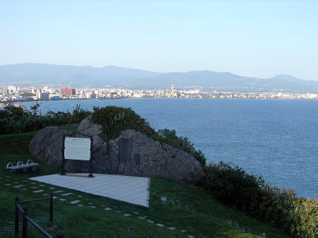 ![]() 与謝野寛・晶子の歌碑 後方は、津軽海峡と函館市街。 |