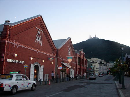 ![]() 赤レンガ倉庫群と函館山 このあたりは、国の重要伝統的建造物群保存地区となっている。 |