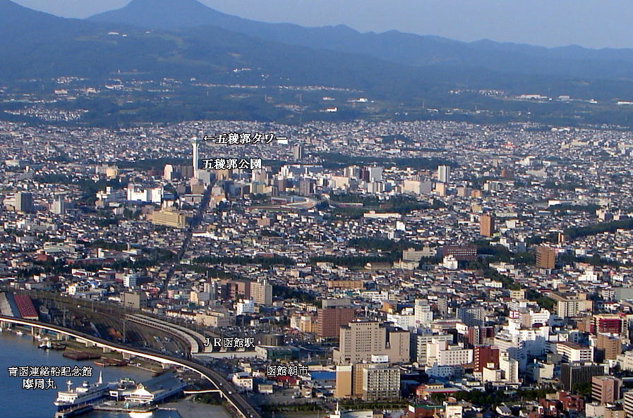 ![]() 函館朝市と函館山 函館朝市は、JR函館駅のすぐそばにある。 |