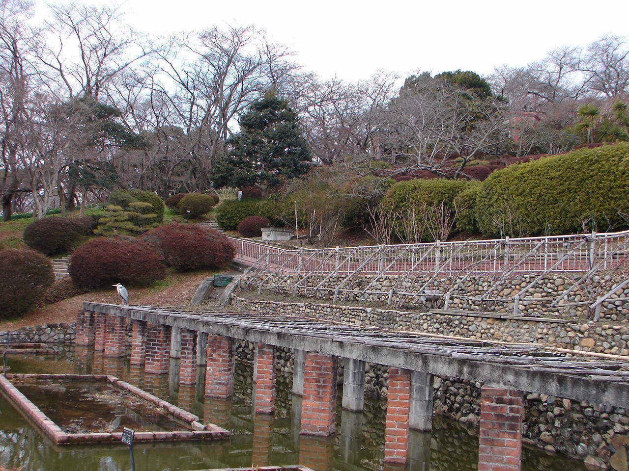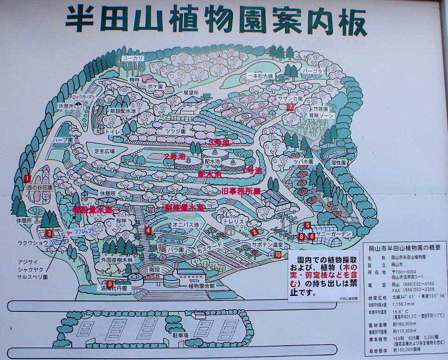 ■岡山市半田山植物園〜岡山市街を一望できる半田山の丘陵地にある半田山植物園は、半田山配水池用地を利用して整備された、約3200種15万本の花木が植栽されている総合植物園で、頂上付近には一本松古墳、中腹には明治時代に造られたレンガの配水池・量水室・旧事務所<いずれも国登録有形文化財(平成17年2月9日登録)>などがある。開園は、昭和39年5月。