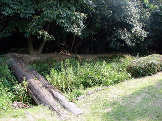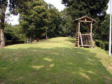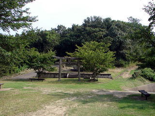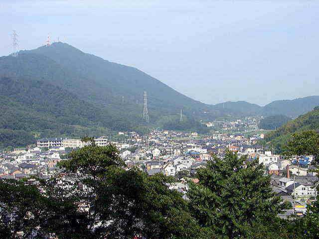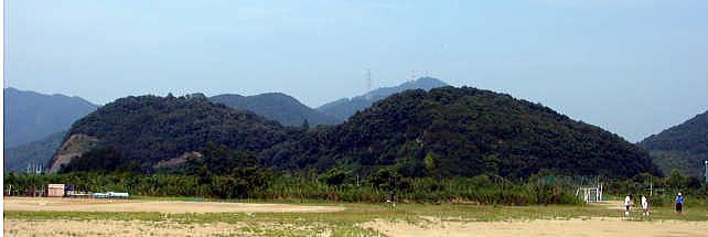 ラクダのこぶのような二つの丘陵の右側が八浜城跡(標高53m)。児島湖は左に位置します。別名 両児山城。遺構として本丸跡・空堀が残る。城跡は両児山公園となっている。車で、二つの丘陵の窪んだ場所まで行けます。