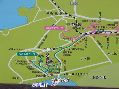 ■八浜城は、宇喜多直家が、児島支配のため築城。猶子の与太郎基家が城主であった。天正9年の八浜合戦(毛利氏対宇喜多氏)の宇喜多方本陣。城主・宇喜多与太郎基家は、八浜合戦の際、毛利勢と戦い僅か18歳で命を落とした。