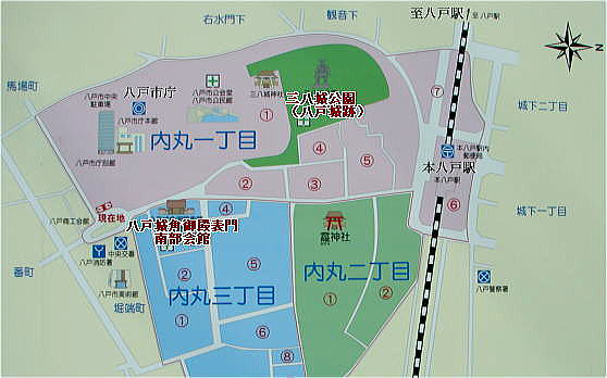 ■下の住居表示図のうち、内丸二丁目・三丁目の一画は、藩政時代の八戸城の二の丸にあたり、藩主一族や重臣の屋敷地であった。