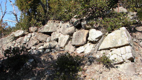 ![]() 本丸 この一帯の曲輪が本丸であり、ここから南東に100mにある長方形の櫓台が天守台と推定されています。 本丸の西側に位置するこの算木積は、隙間に間詰め石を用いる古い積み方で、引田城址で最初に築かれた石垣と考えられています。天守台の存在や石垣に折りが多用されることから、城内でも最も主要な曲輪と位置づけられます。 |