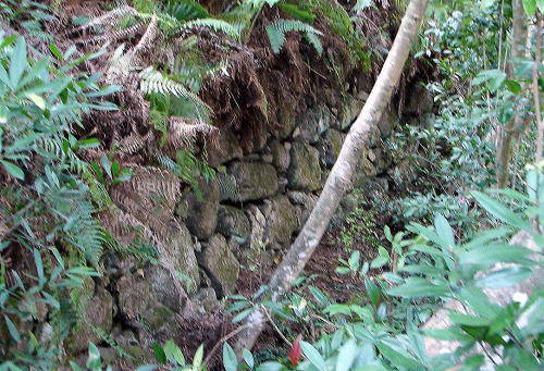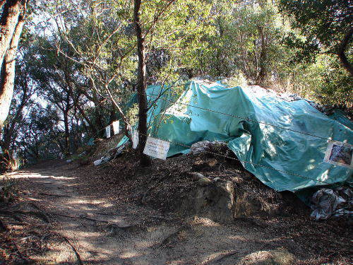![]() 上段の石垣 残念ですが、現在は石垣が崩れる危険があるのでブルーシートで保護しています。右の写真入り「説明文」でしか確認することはできません。 |