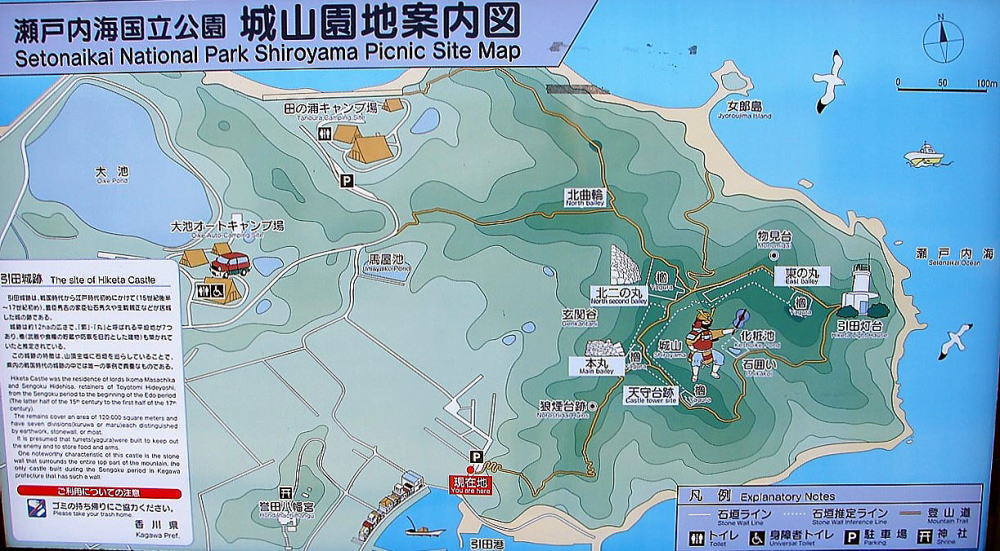 | 引田城跡散策マップ <現在地が引田港側登山口。案内板に一部加筆> ![]() 散策は、引田港側登山口から本丸、天守台跡、化粧池、東の丸、北二の丸と反時計回りに巡り、引田港側登山口に戻りました。 |