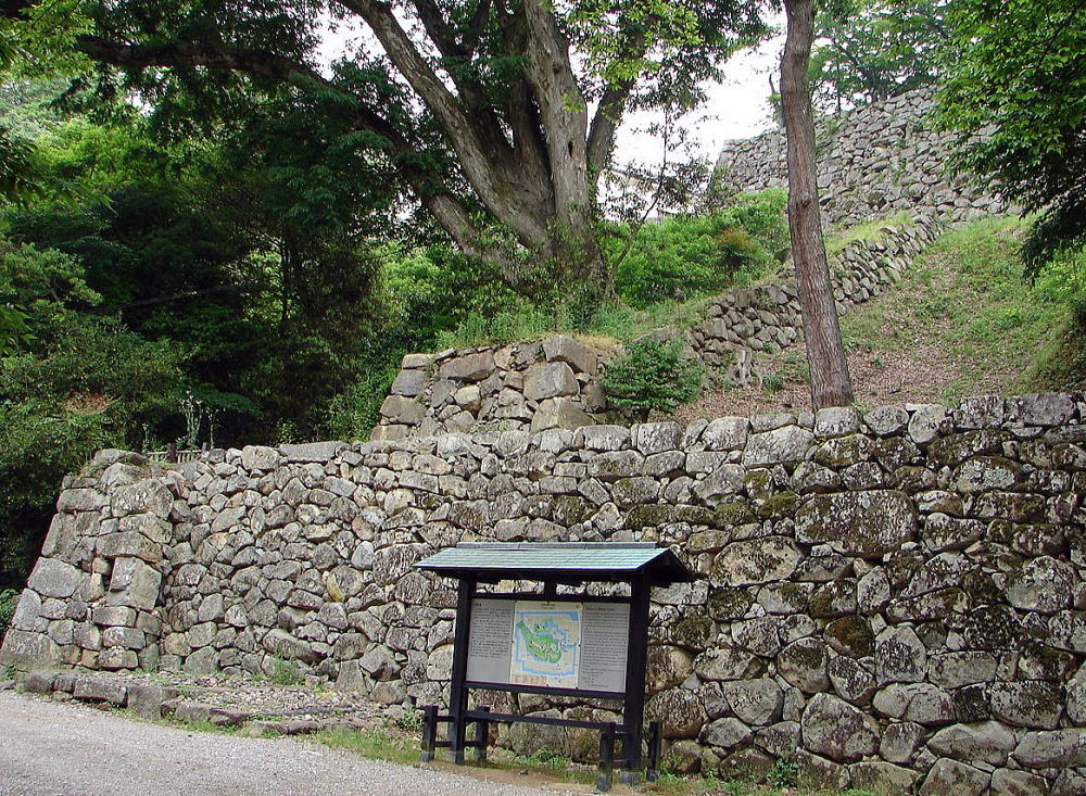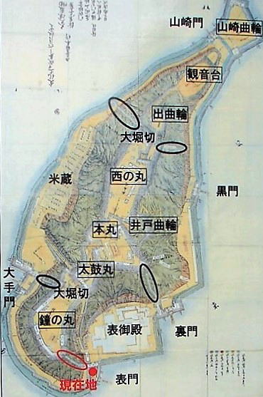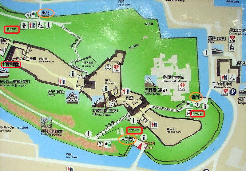 表門・大手門・黒門・西の丸4箇所の「登り石垣」![]() (現地説明板に追記) |
