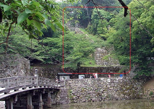 【表門の登り石垣】![]() 写真(上)(右) 赤枠内が登り石垣。斜面を見ると、高さ1mほどの石垣が鐘の丸に向かって伸びているのが分かる。石垣の向かって左側が溝状に窪んでいるのは「竪堀」で、登り石垣とともに斜面を移動する敵の動きを阻止する目的で築かれた。かつてこの石垣の上には、さらに瓦塀が乗っていたようである。 |