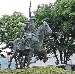 井伊直政公像(JR彦根駅前)永禄4年(1561)現在の静岡県井伊谷に生まれ、幼少の頃から文武両道に励み、慶長5年(1600)に徳川四天王の一人として天下分け目の合戦で知られる関ケ原の戦で功をあげ、石田三成の居城であった佐和山城を与えられ、18万石の大名となった。 その後、城を現在地の彦根山へ移そうとしたが、同7年(1602)41歳で病没し、子らが直政の遺志を受け継ぎ20年の歳月を費やし元和8年(1622)彦根城を完成させた。こうして、彦根35万石初代藩主井伊直政公は、今日の彦根市発展の礎を築いたのである。(現地説明板より) |