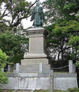 井伊大老銅像(金亀児童公園)井伊直弼(なおすけ・1815〜1860)。開国の英雄井伊直弼は、文化12年(1815年)に彦根城下の下屋敷(槻御殿)に生まれ、嘉永3年(1850年)36歳で彦根藩主となり、安政5年(1858年)には江戸幕府の大老職となった。 同年6月、直弼は我国の将来を考えアメリカとの開国を英断。この大偉業をなしとげた直弼は、心情をくむことのできなかった人々によって安政7年(1860年)3月3日桜田門外で暗殺され46年の生涯に幕を閉じた。(現地説明板より) |