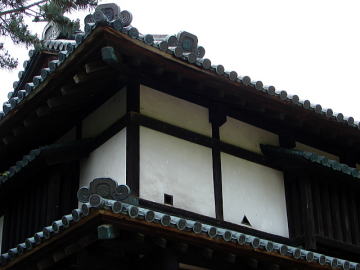 ▲外壁の表面は、白漆喰を仕上げ塗りする塗籠であるが、古式な形を残す弘前城城門は、柱を見せる壁の仕上げである真壁造(しんかべづくり)になっている。
